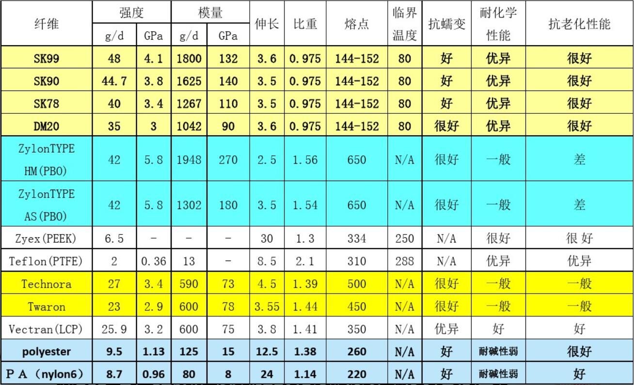 1、国外绳缆企业使用的HMPE纤维的性能指标